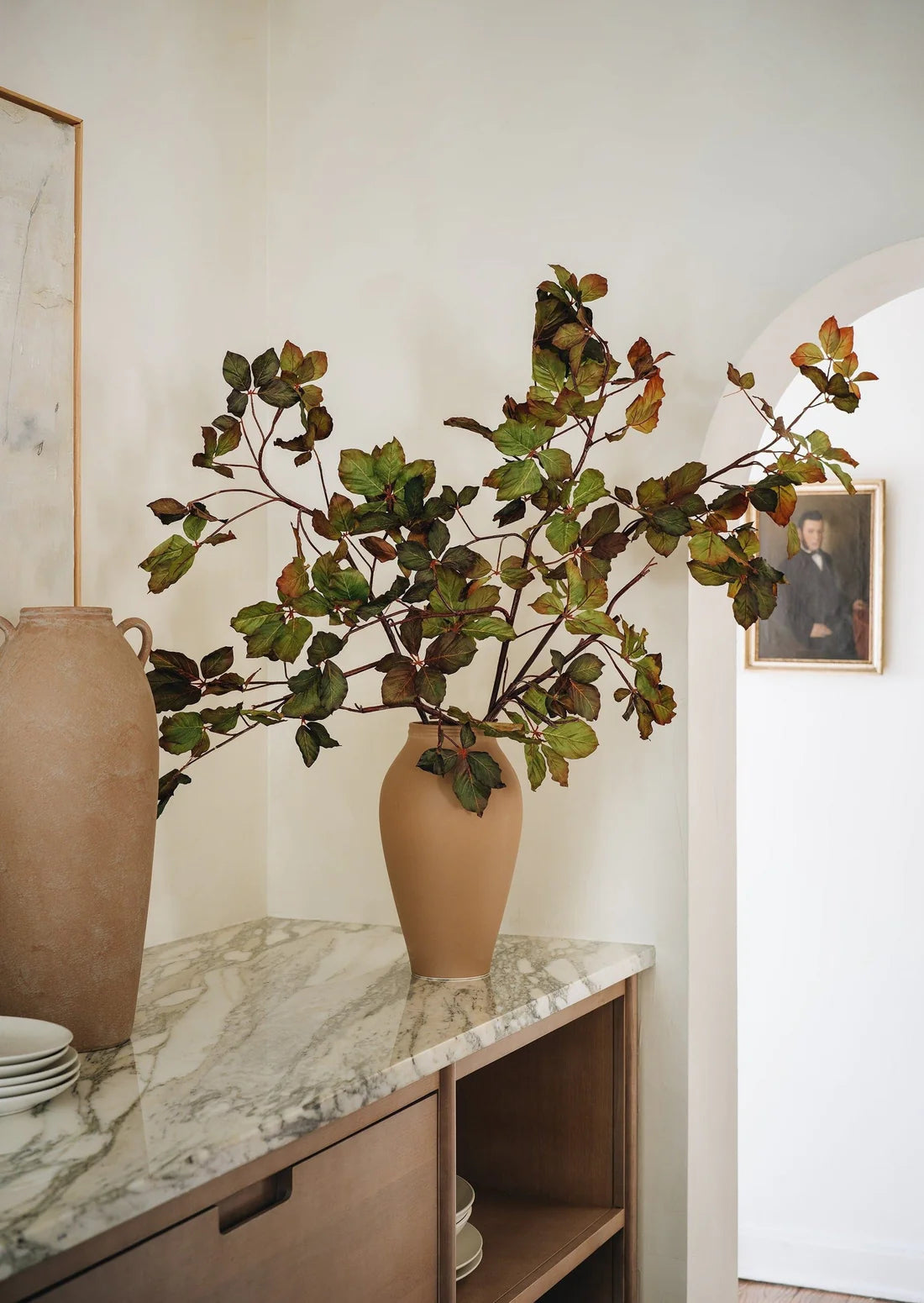 As featured in Homes & Gardens, our faux chestnut leaf stem brings effortless elegance and natural charm to any interior. With its rich burgundy and green leaves, this tall artificial branch captures every botanical detail for a strikingly realistic look. Ideal for elevating your home decor year-round, it offers an easy way to create a sophisticated table centerpiece or a graceful accent in a vase—delivering everlasting beauty without maintenance.